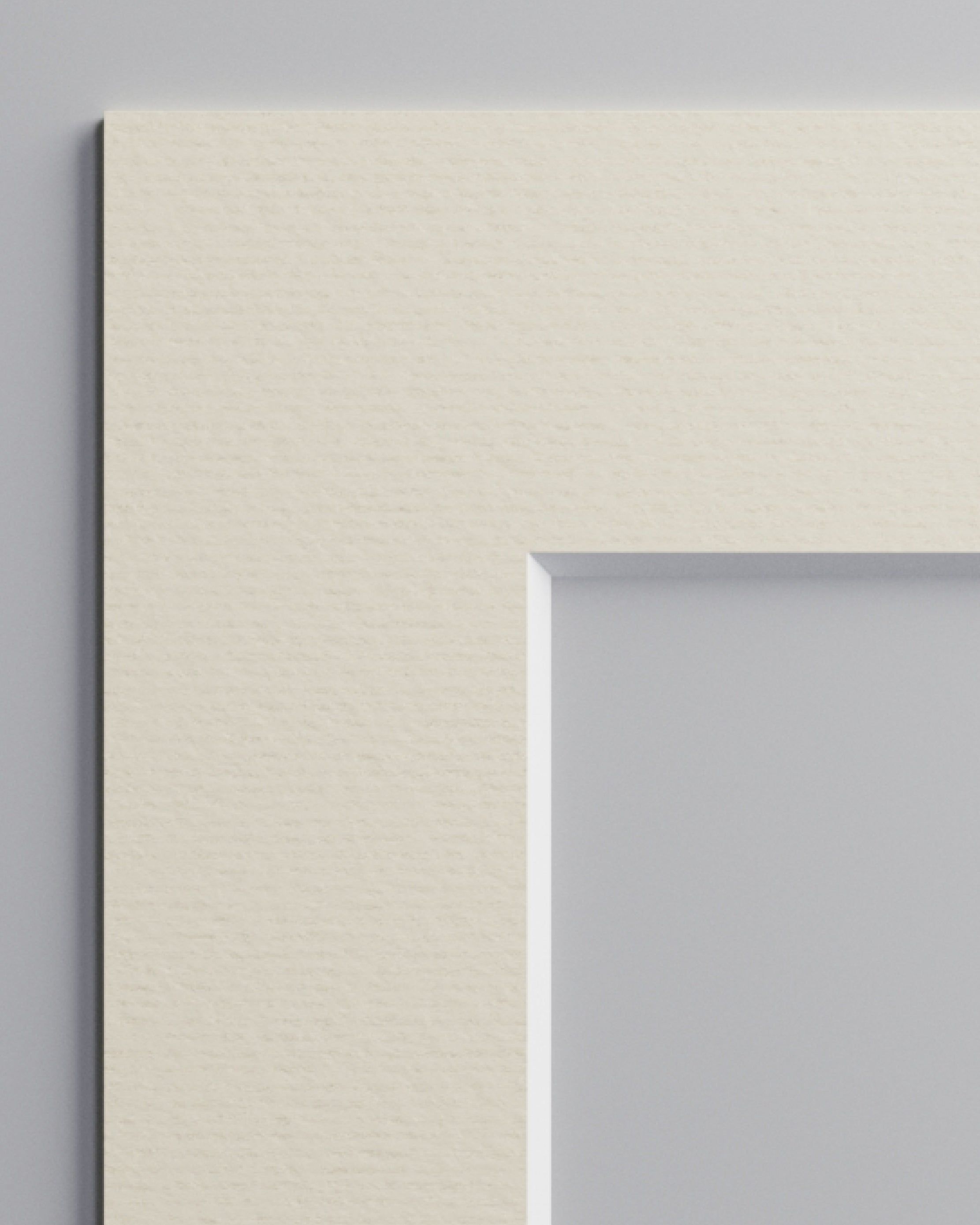 Denne creme passepartout har en subtil varme og et tidløst udtryk. Fremstillet i 1,5 mm syrefrit karton og skåret med en præcis 45-graders vinkel, der afslører den hvide kerne og skaber en elegant adskillelse mellem billede og ramme.