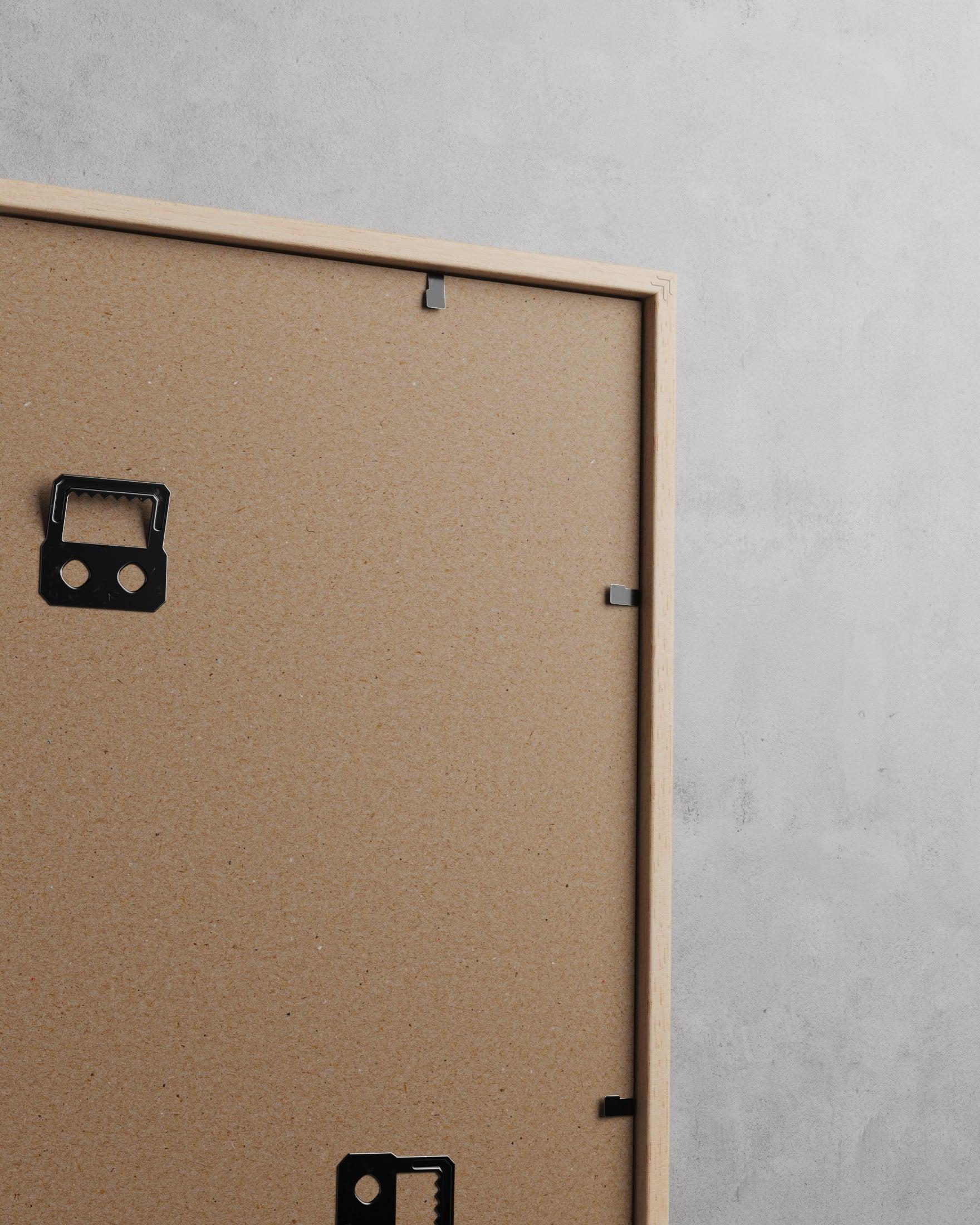 Helt enkelt monterer vi en tynd træliste (fås i eg, sort eller hvid) på 14 mm mellem glasset og bagpladen.