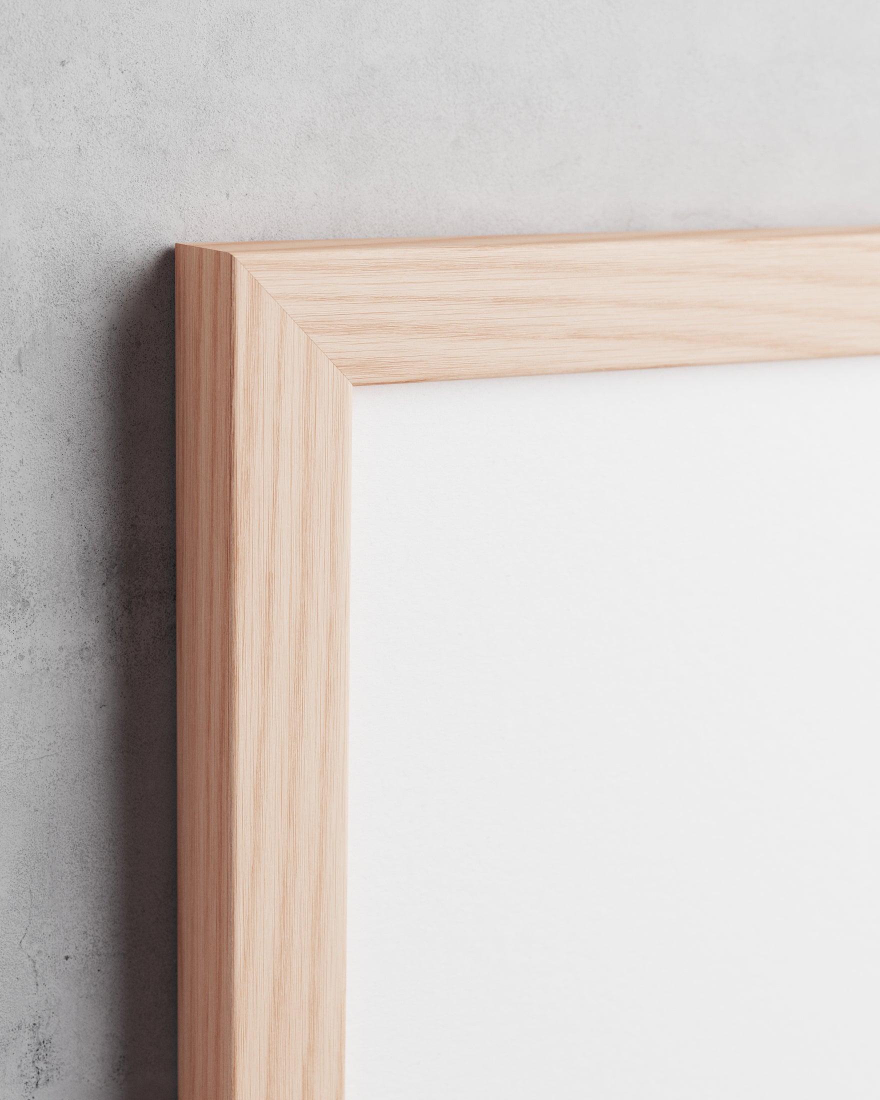 Rammen er fremstillet i massiv egetræ med en naturlig, ubehandlet finish, der lader træets fine åretegninger og varme tone træde frem. Resultatet er en ramme med organisk karakter og naturlig elegance – perfekt til skandinaviske hjem og kunstværker, der fortjener at få plads.
