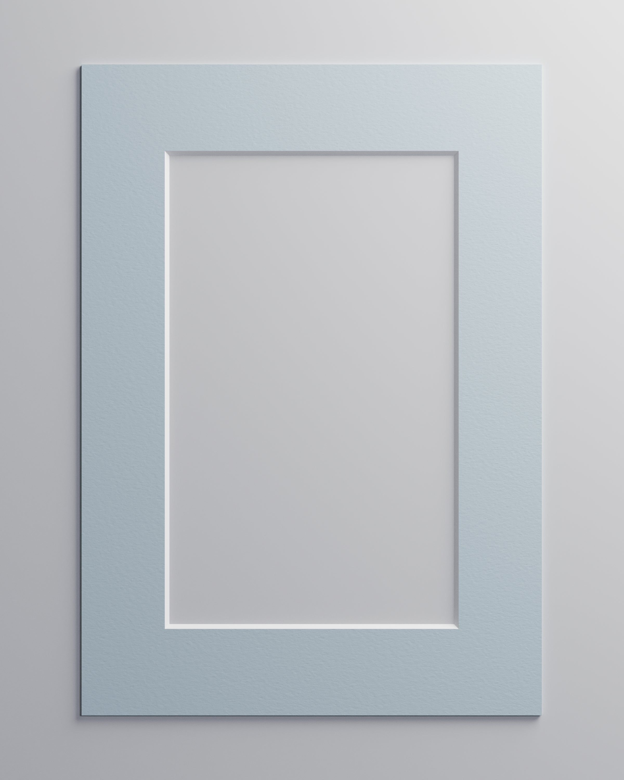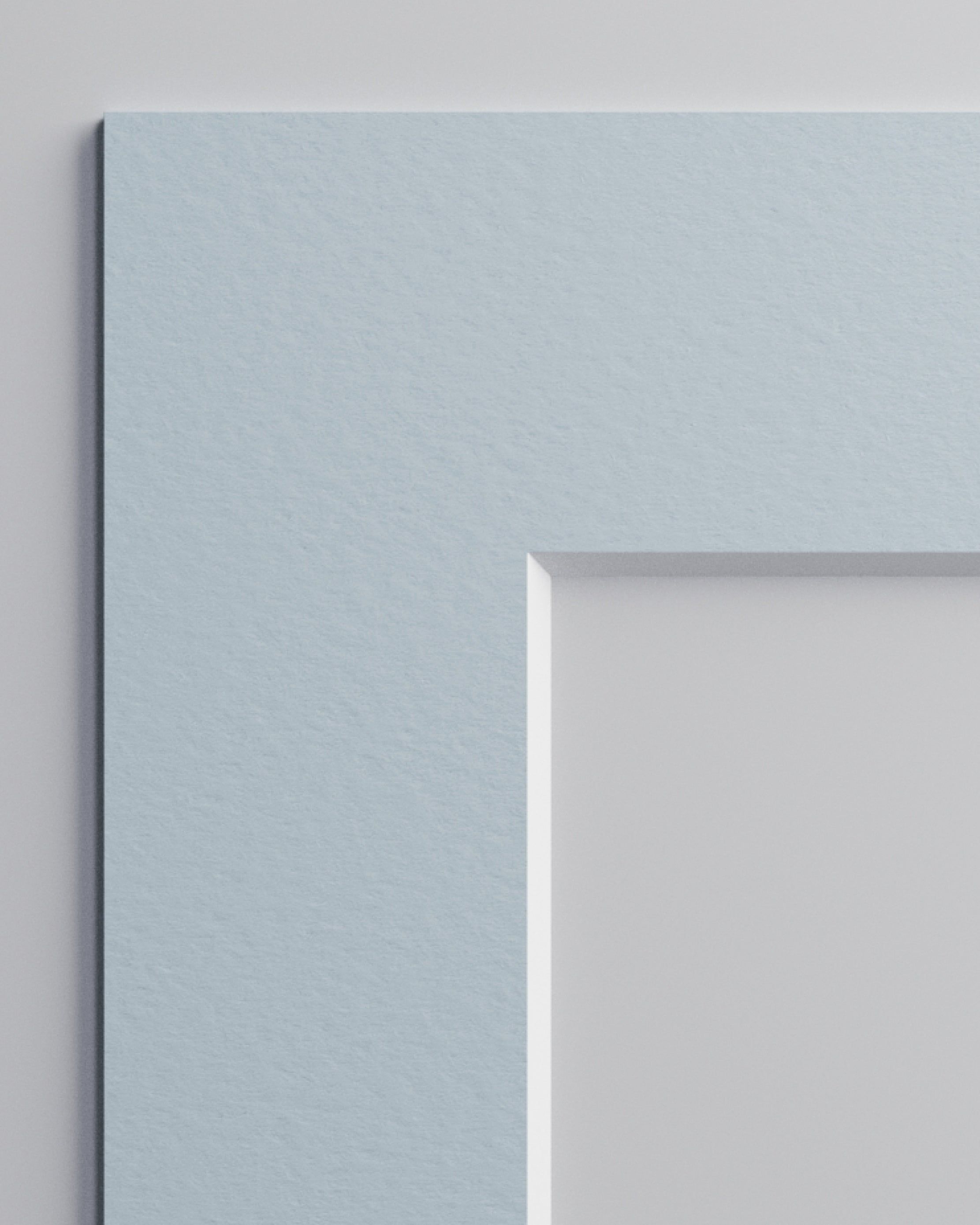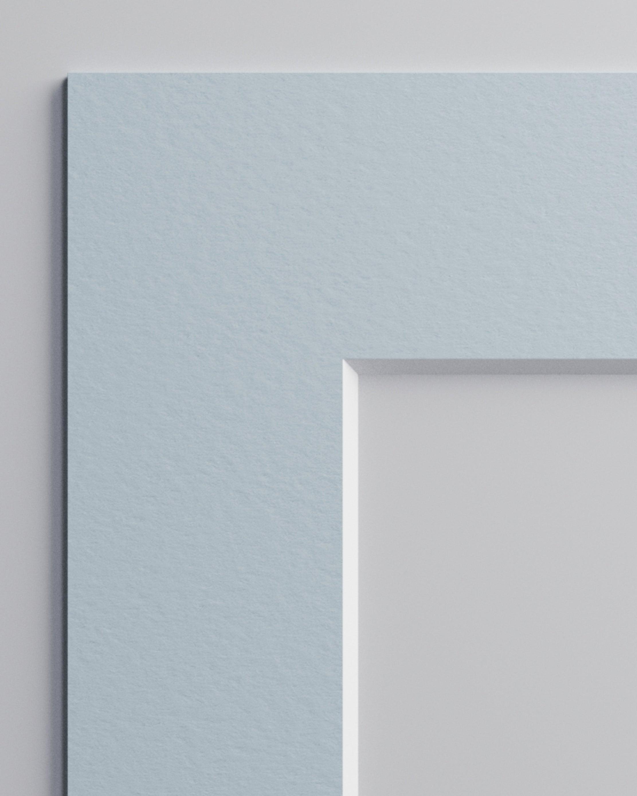 Denne lyseblå passepartout giver din indramning et let og luftigt udtryk. Fremstillet i 1,5 mm syrefrit karton og skåret med en 45-graders vinkel, hvor den hvide kerne skaber en ren og delikat ramme omkring motivet.