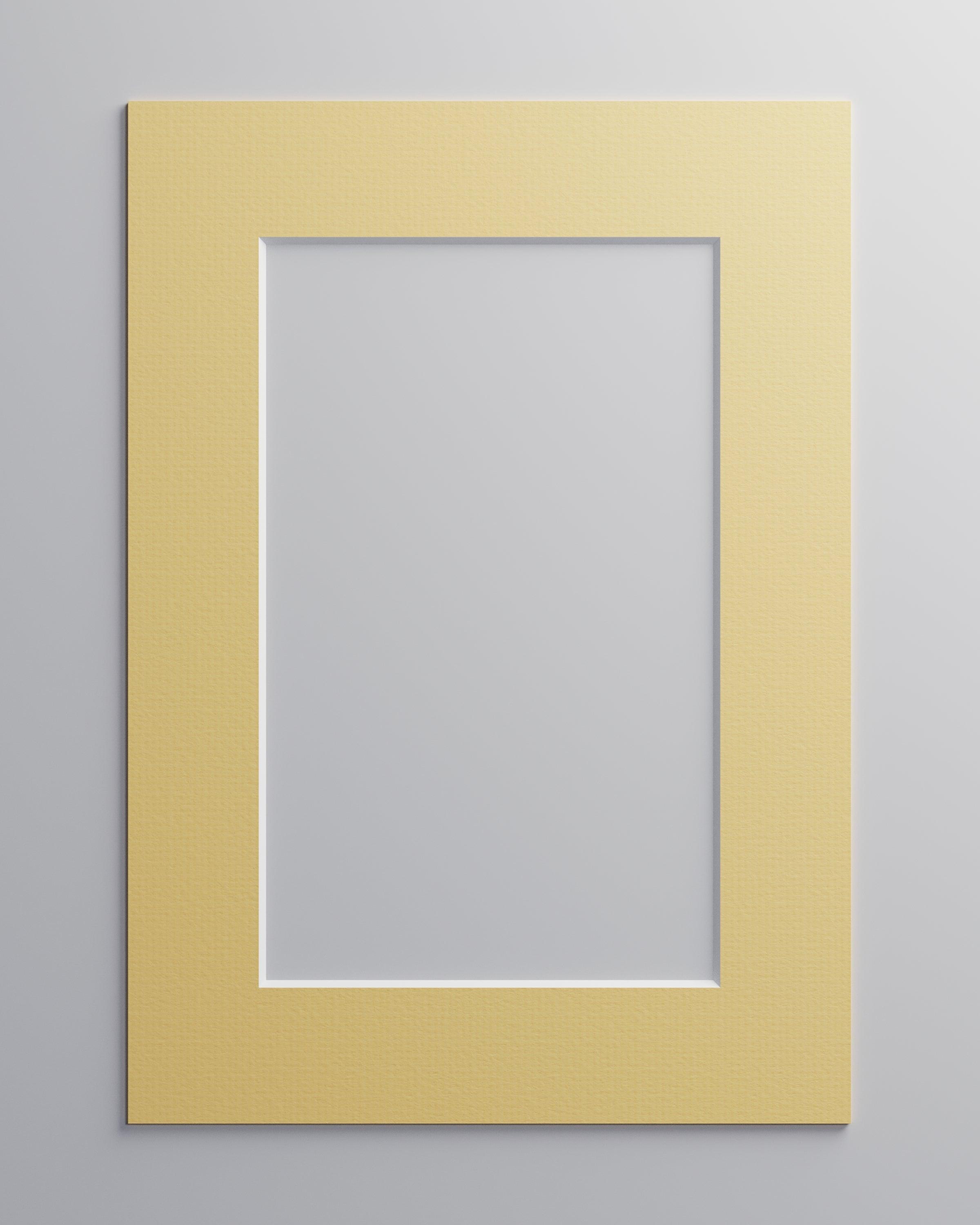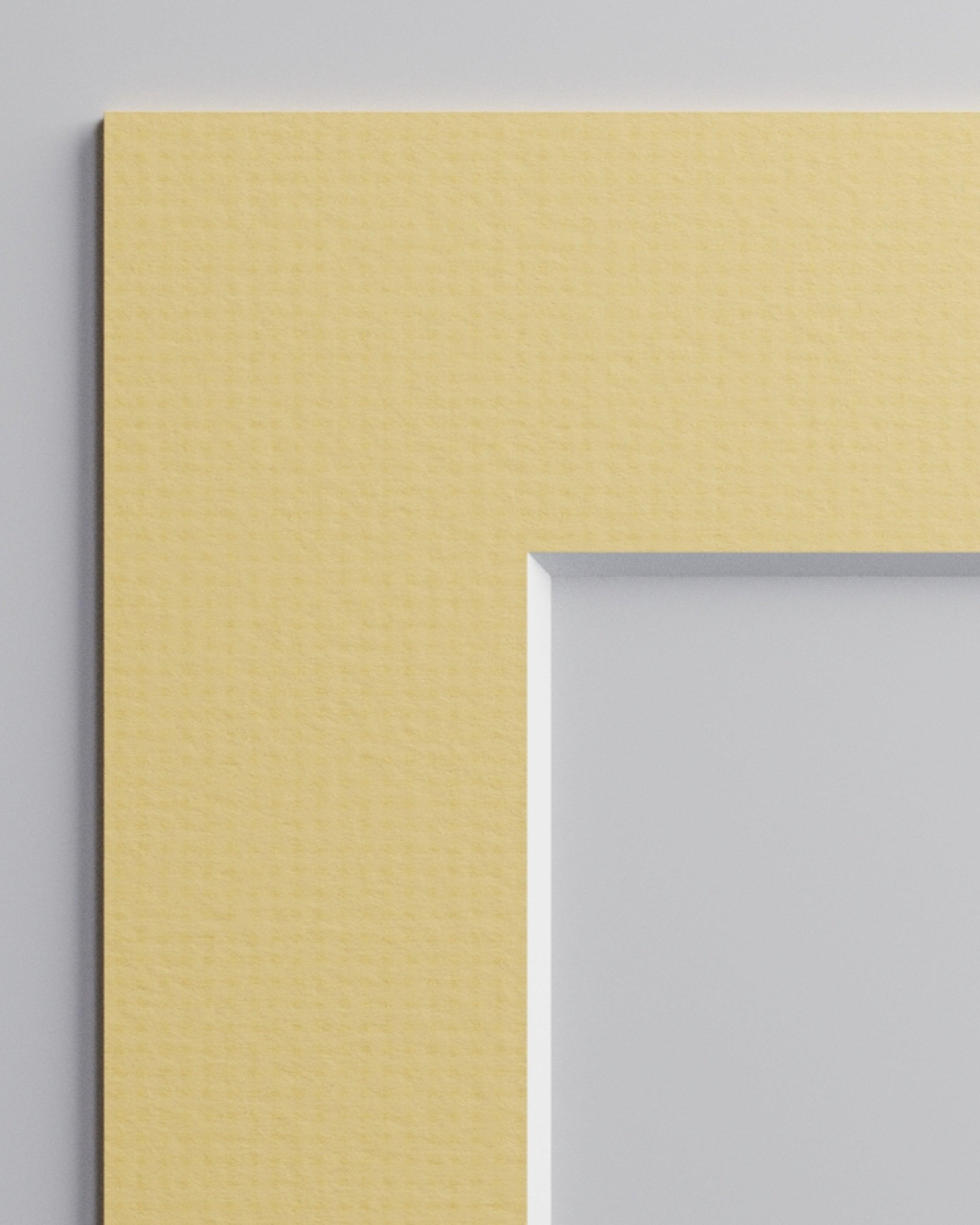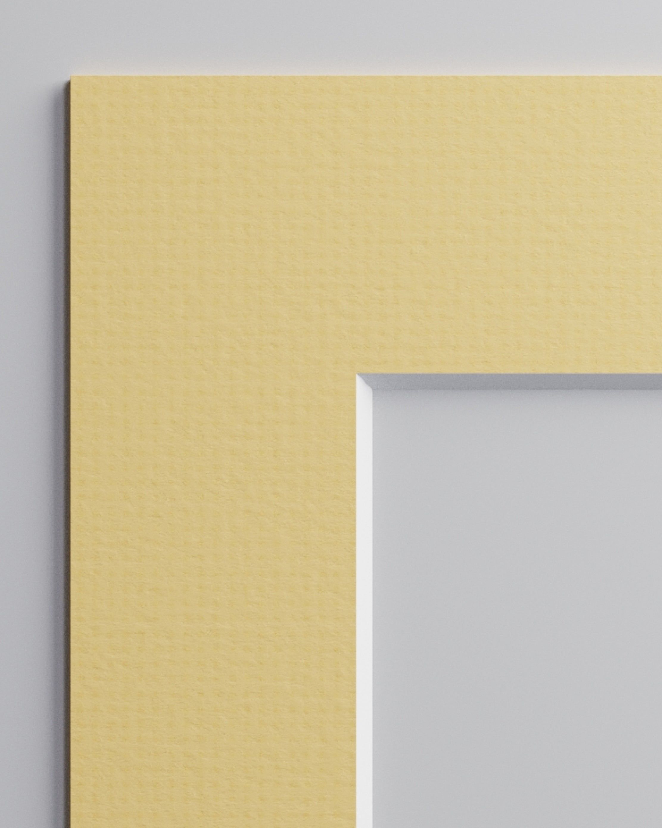En livlig gul passepartout, der tilfører varme og energi. Fremstillet i 1,5 mm syrefrit karton og skåret med en 45-graders vinkel, hvor den hvide kerne skaber en skarp og lys ramme omkring motivet.