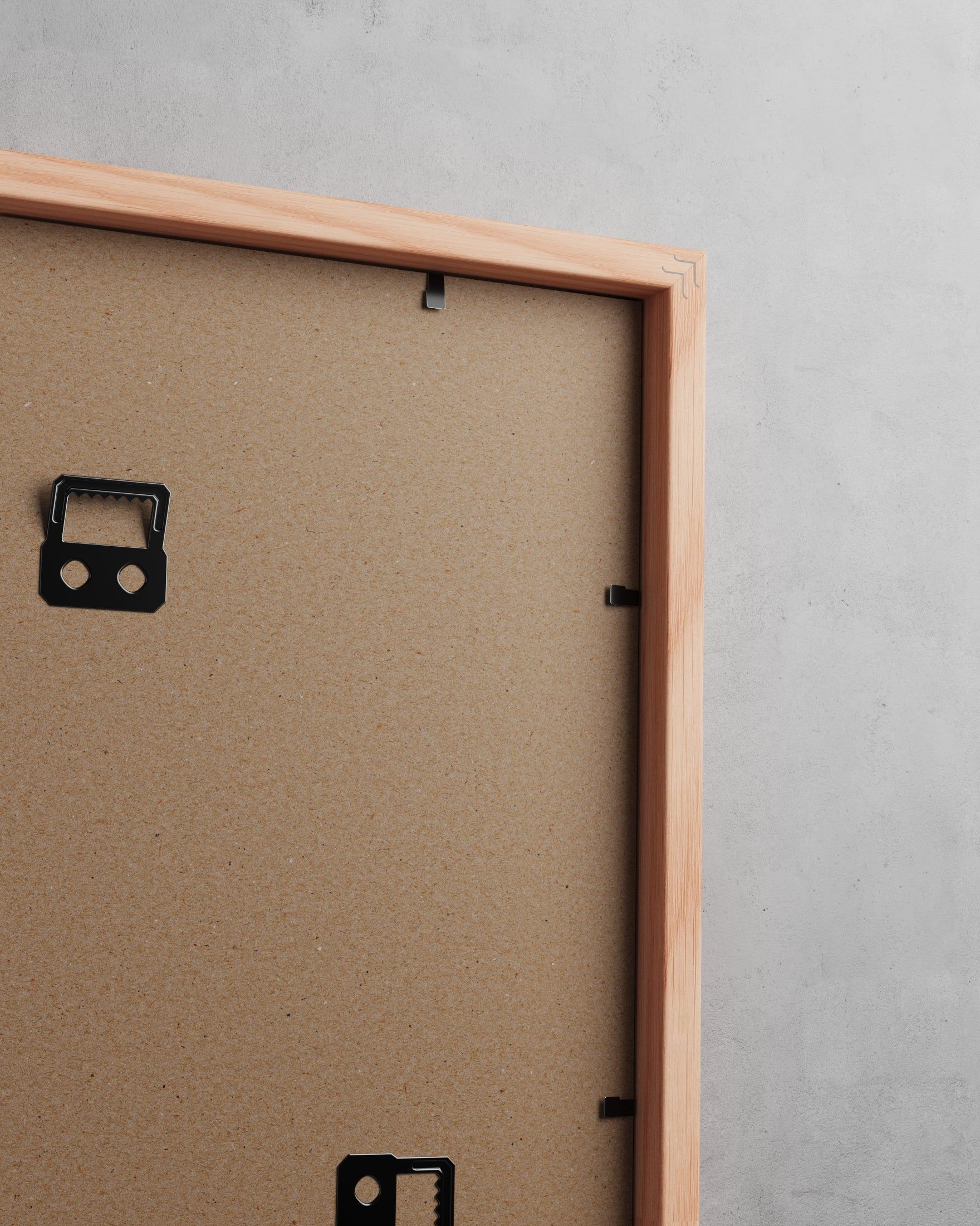 Helt enkelt monterer vi en tynd træliste (fås i eg, sort eller hvid) på 14 mm mellem glasset og bagpladen.